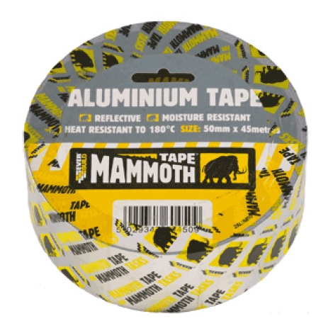 EVERBUILD Mammoth Aluminium Tape is a heat and light reflective foil tape, heat resistant to1800C and flame resistant to class O. Excellent moisture resistance, ideal for use as a vapour barrier between foil faced insulation panels in roof and wall applications, duct sealing on all types of air conditioning and ventilation. Protecting wires and pipes from heat.