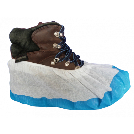 They have a blue CPE coating on the sole and a white non-woven Polypropylene upper.