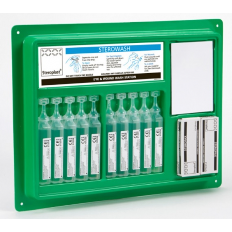 Eyewash Pod Station c/w Mirror • Eye Wash Pod Station • 10 x 20ml Pods • 2 x No 16 Eye Pad Dressings • Mirror