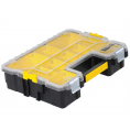 The Stanley 197518 FatMax Deep Pro organiser has 10 removable storage compartments, providing storage for small parts, components or accessories, which can also be stacked together for use outside the organiser. Made from polypropylene, the organiser has a tough, heavy-duty lid that allows the contents to be viewed easily and features a waterproof seal that not prevents water, rust and foreign particles from entering. A plastic handle with a textured grip allows the organiser to be moved comfortably, and the organiser's lid has been specially designed to ensure that the compartments are held securely in place and fastens with two metal latches. For added versatility, multiple organisers can be clipped together using the side latches for easy transportation. This product weighs 2 kg.