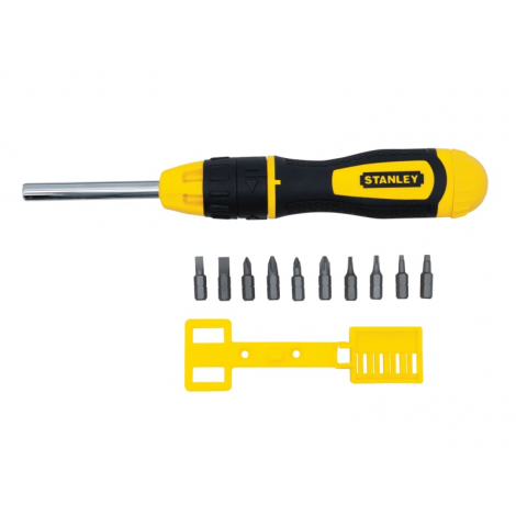 The Stanley 0-68-010 Multibit Ratchet Screwdriver features a patented bit storage system for ease of visibility, access and security. It also has a spring loaded, hard wearing, ball bearing indexing mechanism for quick and easy access.