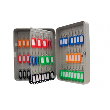 This key cabinet is the ideal solution for organizing and storing up to 93 keys. Constructed from durable powder coated steel, the key cabinet is secure and reliable. The included cylinder lock ensures that keys are always safe and sound. The key cabinet also comes with self adhesive numbers and coloured key fobs, making it easy to keep track of your keys. Fixings are included so that the key cabinet can be bolted to a wall, making it even more secure.