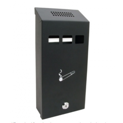 Cigarette Bin, with sloping top design. Wall Mounting. Removable collection box. Size: 323 x 147 x 60mm. Finish: Black.