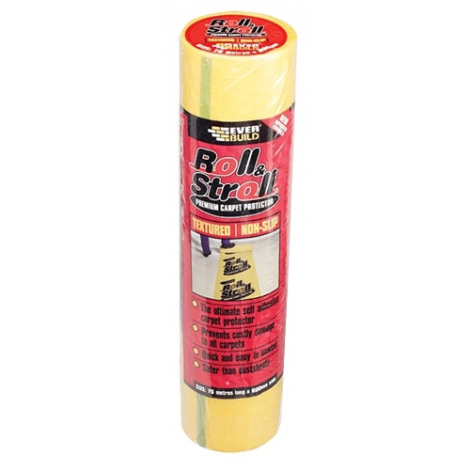 Roll & Stroll Premium Carpet Protector is the ultimate self adhesive carpet protection system. With the adhesive coating on the outside Roll & Stroll Premium Carpet Protector is easy to unwind, safer than dustsheets and has a multitude of uses across all trade sectors. Totally waterproof Roll & Stroll Premium Carpet Protector protects against paint spillage, is heavy duty so won't tear or rip. It is also now available in a textured non-slip roll.