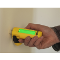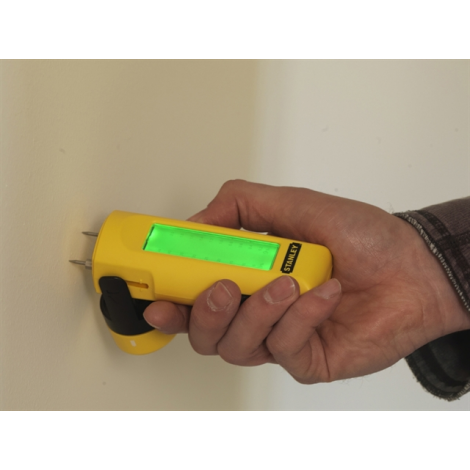 The Stanley Intelli Level Moisture Meter gives a % moisture reading based on electrical resistance across two pins. LCD screen with dual measurement bar graph. Measures moisture in wood: 6-44%, and other building materials: 0.2-2%.