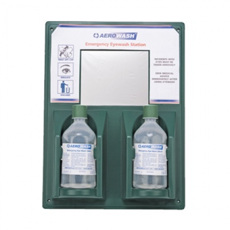 Eye Wash Station c/w Mirror • Eye wash station • 2 x 500ml solution bottles • 2 x No16 eye bandages • Mirror 370mm x 260mm (w x h)