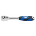 Expert Quality, forged from chrome vanadium steel hardened, tempered, chrome plated for corrosion protection. 60 tooth ratchet with lever forward/reverse selector and "quick release" mechanism for secure socket and accessory holding and easy release. Spring-loaded ball bearing for secure socket holding. Soft grip handle for user comfort. Display packed. Brand: Draper.