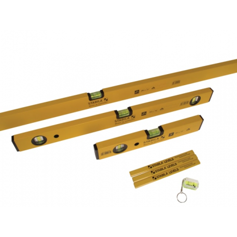 Traditional spirit level with smooth sides and electrostatic powder coating.