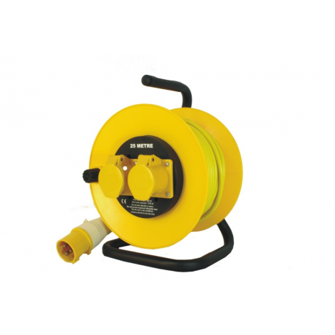 Robust, heavy duty, steel-framed cable reel with thermal overload and power reset button. 25m 1.50 mm Cable 2 x 16A Sockets PVC Drum/Metal Stand 110v 16A Plug Maximum load 16A.
