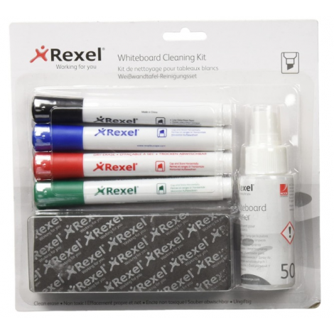 Contents: 1 x Rexel Whiteboard Starter Kit, Four Markers, Cleaner and Eraser, 1903798